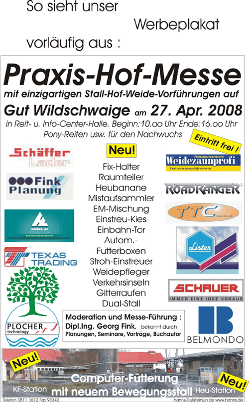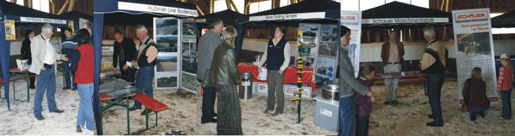 Man sei auf einem erfolgversprechenden Weg, eine für alle interessante Spezial-Messe aufzubauen. Eine Nachfolge-Praxis-Hof-Messe wird deshalb von uns erwogen. Moderator Dipl.Ing. Georg Fink und Hanns Ullstein jun. hatten alle Hände voll zu tun, bei den Führungen sämtliche Fragen ausführlich zu beantworten. |