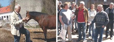 Santa Klaus, über 26 Jahre alt, ehemaliger Bay. Staatshengst, lebt seit sieben Jahren hier und staunte nicht schlecht, als er Dr. Pirkelmann direkt vor seiner Bewegungsbox entdeckte. Dr. Heinrich Pirkelmann, damals für die Landtechnik in Weihenstephan tätig, probierte erstmals Computer-Fütterungs-Technik hier aus. Später war er Leiter der Bayer. Landesanstalt für Landwirtschaft in Grub.