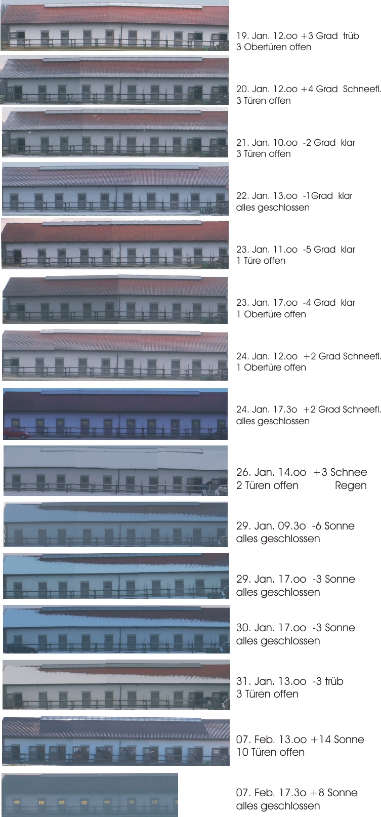 Die nachfolgenden Bilder zeigen eine "Artgerechte Pferdehaltung" laut Originalton des Pferdehalters und der dortigen Pferdebesitzer. Von den 150 Boxen-Bildern waren nur ganze 19 Boxen-Türen geöffent = knappe 13 % und 5 Boxen-Obertüren auf = gute 3 % !