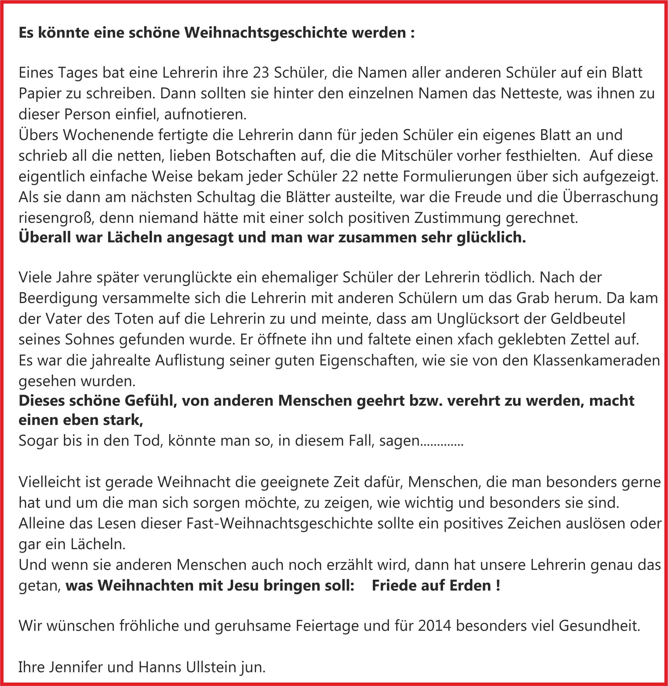 24. Dezember 2013 Eine mögliche "Weihnachts-Gechichte" ....Durch einen technischen Fehler konnte der Weihnachts-Neujahrs-Gruß erst nach dem Drei-Königstag hier gestgellt werden.