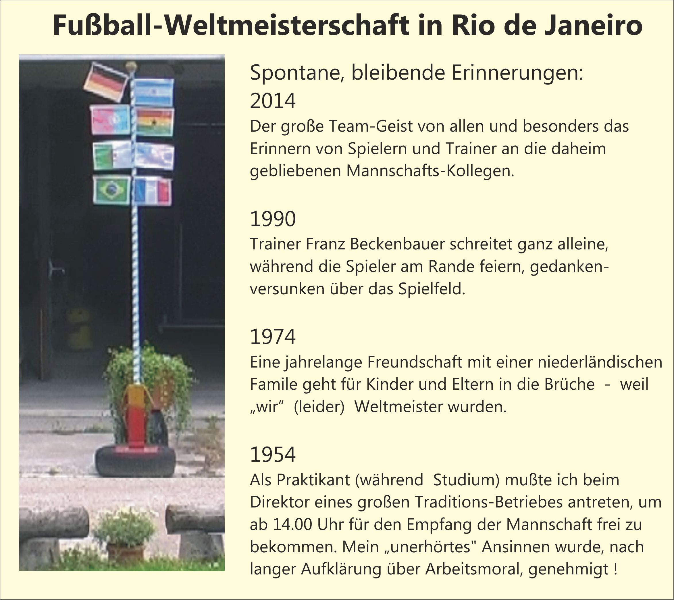 13. Juli 2014 Fußball-WeltmeisterschaftSeit 1990 ist Deutschland zum 4. Male wieder Weltmeister geworden. Was wird mir als Erinnerung bleiben ? Und was blieb von 1990, von 1974 und von 1954 übrig?