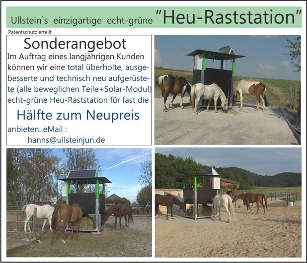 Aus diesem Anlaß bietet sich die große Chance, eine echt-grüne Heu-Raststation zu wirklich günstigen Bedingungen zu erhalten. Durch die gewissenhaften Überholungsarbeiten kann bedenkenlos davon aus- gegangen werden, dass die an sich schon robust gehaltene Bauweise die üblich lange Lebensdauer, wie bei einer neuwertigen, erreichen wird.
