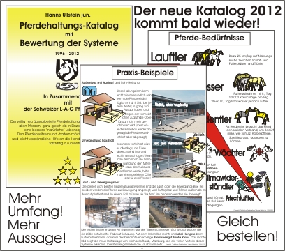 Der neue einzigartige "Pferdehaltungs-Katalog 2012" umfaßt nun 16 Seiten, gedruckt auf umweltschonendem Hochglanz- Papier im 4 Farb-druck, im handlichen DINA 4 Format. Zahllose Fotos und Zeichnungen zur besseren Erklärug mit übersichtichen leicht zu verstehenden Texten. Starke Verbesserung für "Profis": Der Pferdehaltungs-Katalog 2012 ist die Basis für weitere, zukünftige Seiten, die dann in ihn eingelegt oder abgeheftet werden können. Somit entsteht ein Nachschlagewerk bzw. Pferdehaltungs-Handbuch, das immer aktuell ist und dadurch zu jeder Zeit schnell gute Lösungen anbieten wird. Spezial-Service für alle Besteller: Wer fachliche Fragen zum Katalog hat, kann sie per eMails einsenden. Innerhalb von 48h werde ich ausführlich und verständlich antworten. Alles natürlich kostenlos.